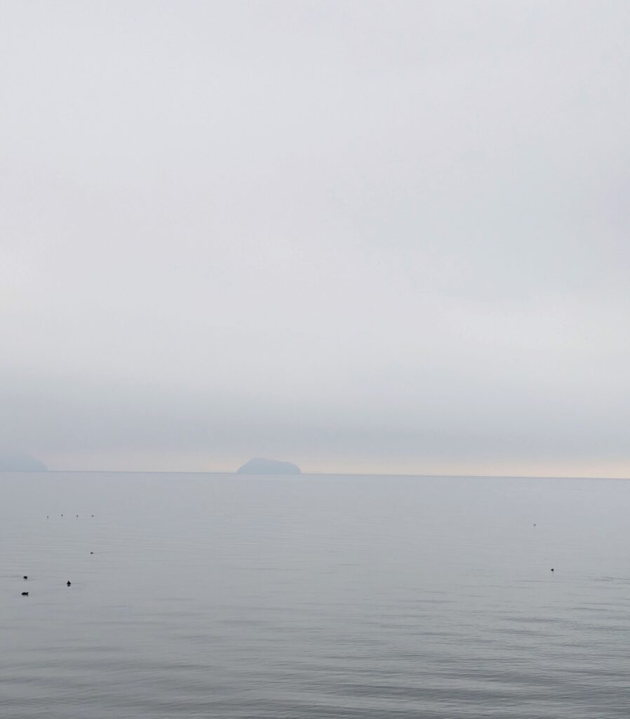 びわ湖は静かで、雲に包まれた景色がとてもきれいでした。