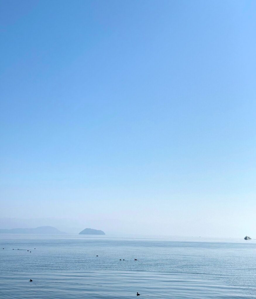 今日の 琵琶湖 はとても穏やかで、空と湖がやさしい色でつながっているような景色でした。