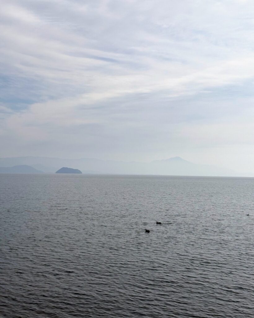 びわ湖沿いをゆっくり歩いていると、湖の上では水鳥たちが気持ち良さそうに浮かんでいました。