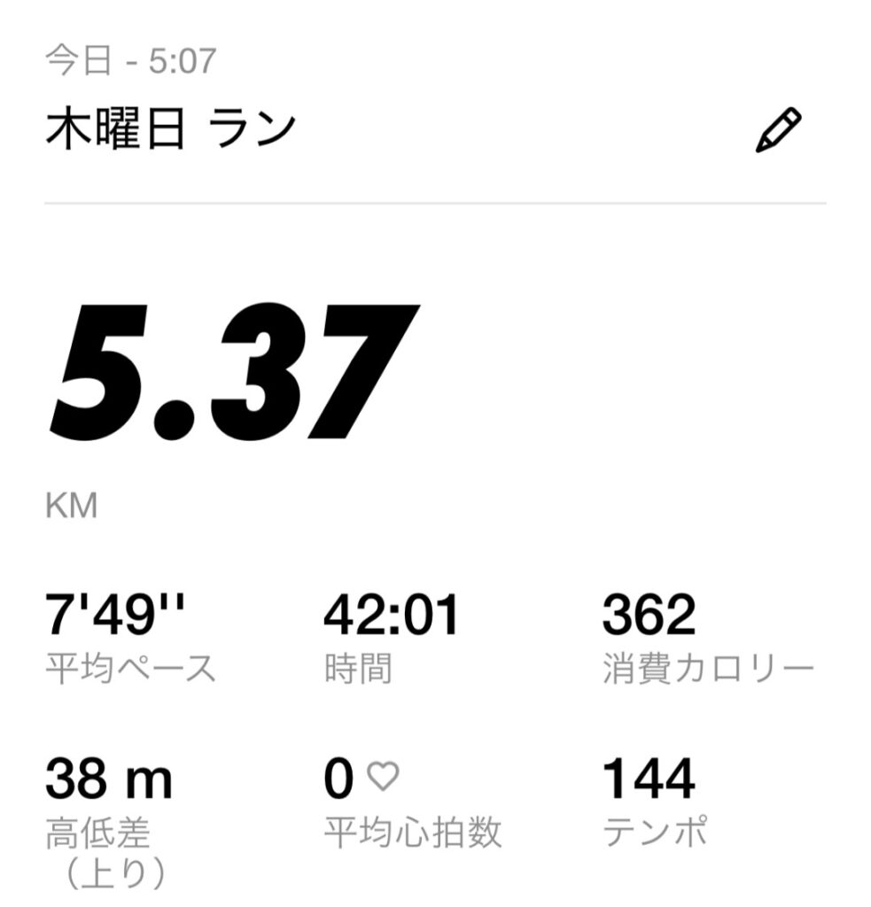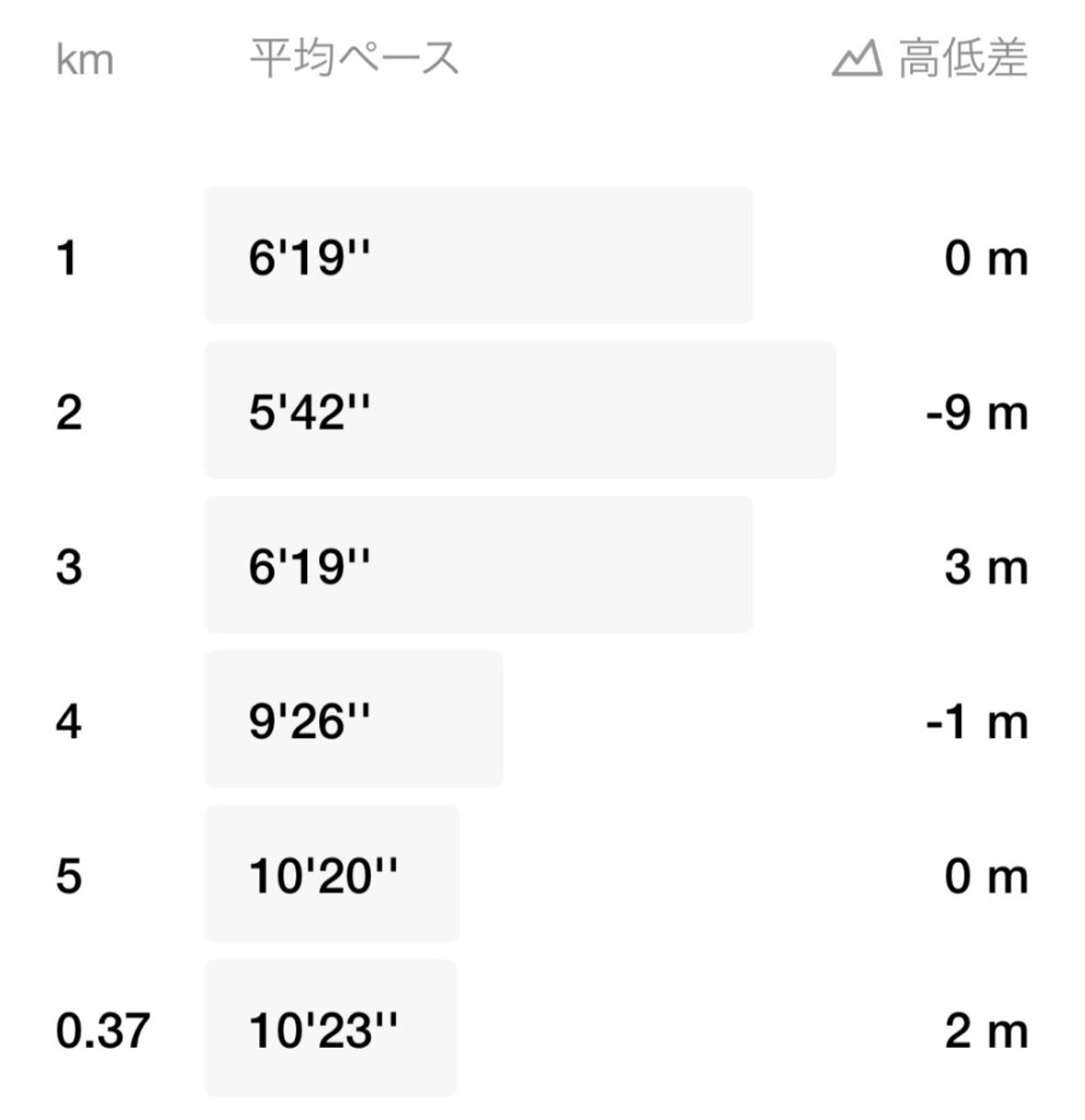 最初の3kmはゆっくりペースで走り、その後は無理せず2kmほど歩いて呼吸を整えました。