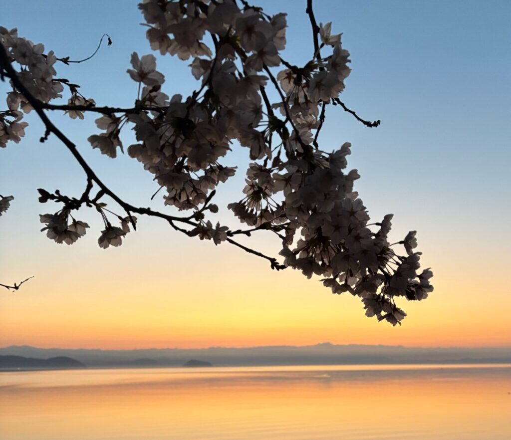 びわ湖沿いを歩くと、満開のさくらが風に揺れていて、その景色がとてもきれいで、思わず足を止めて見入ってしまいました。