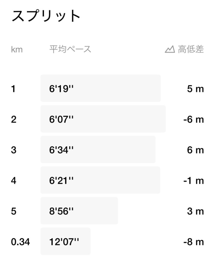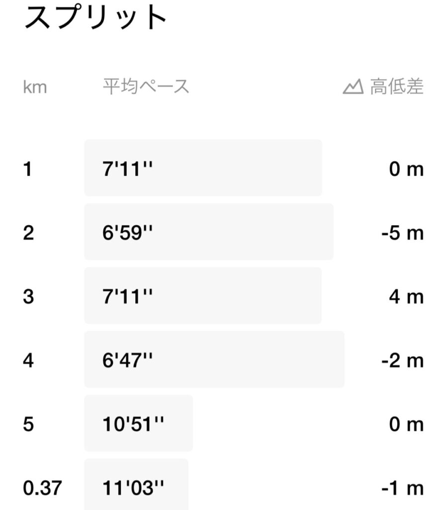 少し息が上がったので、その後は2kmをゆっくり歩いて調整しました。