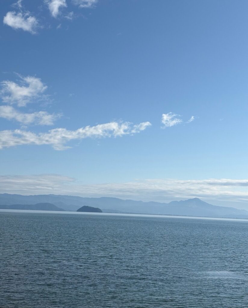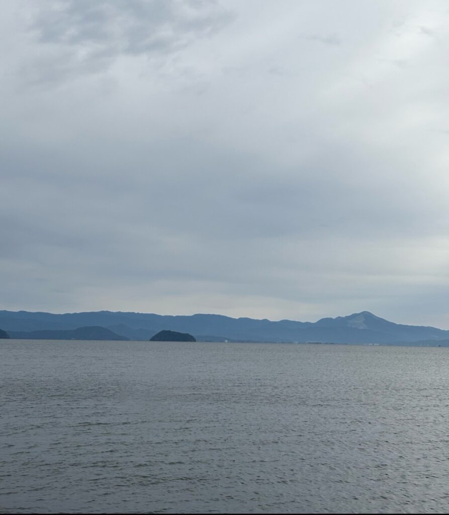 湖の水面が静かで、遠くの山も少し霞んで見えて、なんだか穏やかな朝。
