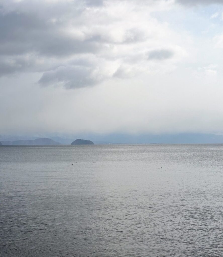 静かな湖面と、遠くの島が霞む景色も雨ならではの雰囲気でとても落ち着きますね。